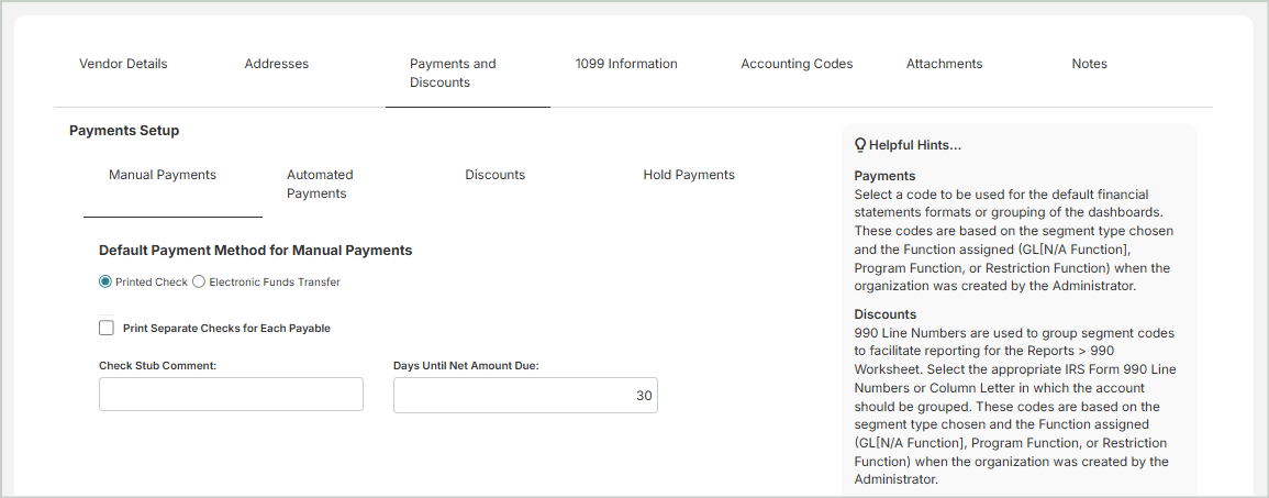 Hold Payments: Select this option to hold payments to this vendor. When a vendor is on hold, the system will not generate checks for them. You can still create and link invoices, but checks - including system-generated ones - will not be printed. If you attempt to enter a manual AP check for a vendor on hold, a warning message will appear, but you can choose to proceed. Note that invoices can still be created and linked to the vendor but checks will not be printed.