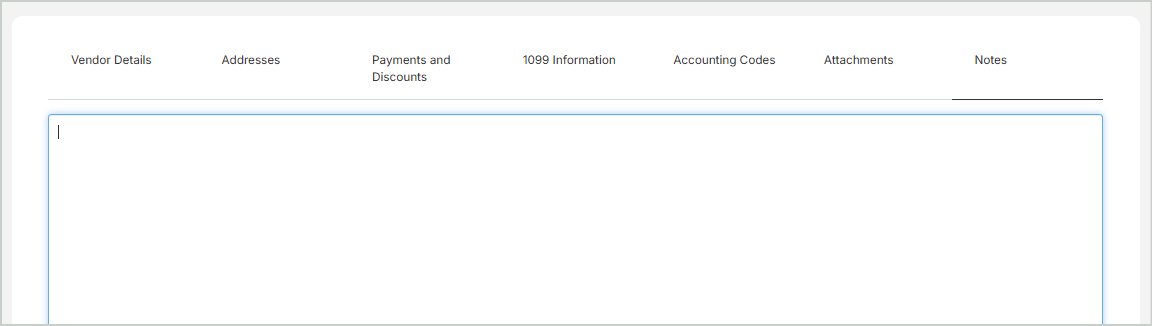 Use the Notes tab to add any specific notes or reminders about the vendor. This is a free-form area where you can type longer entries. Press Enter to start a new line.