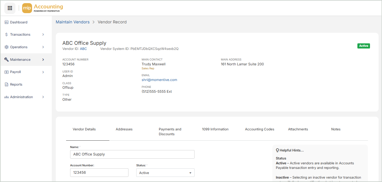 View & update details for a vendor, including contact information, payment terms, and accounting codes.