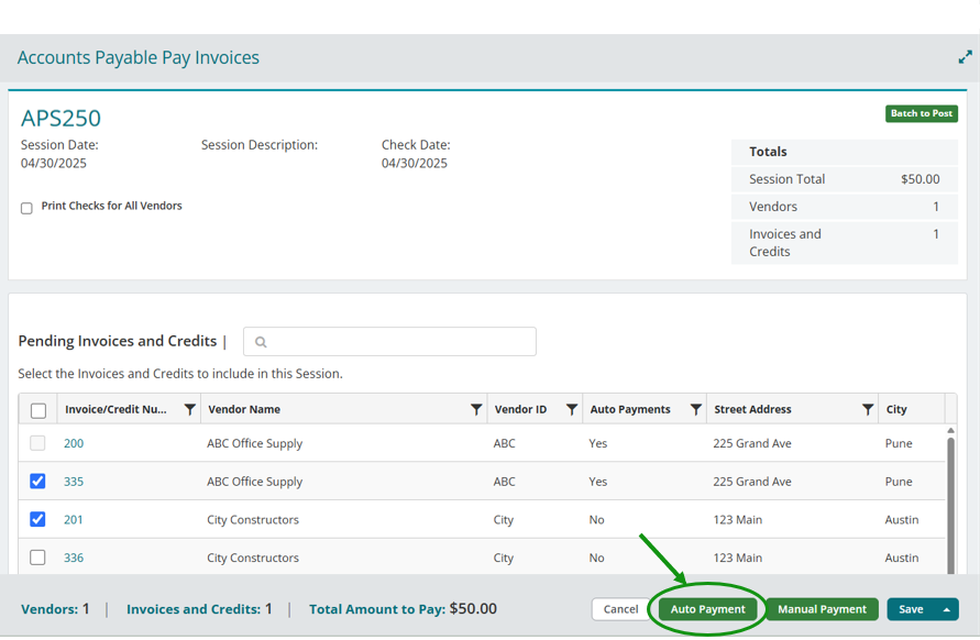 If a vendor’s net payable is zero or negative, the system displays a pop-up message and excludes that vendor from auto payment.