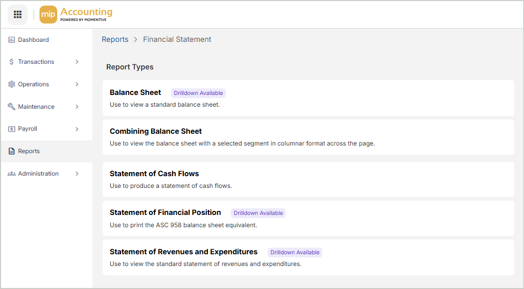 The Drilldown feature is now available in several reports. Drilldown is a reporting functionality that lets you move seamlessly from high-level report balances to the specific transactions that make them up. With a simple click, you drill into the details behind report values - such as transaction history, document information, and supporting attachments.
