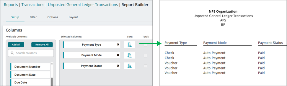 Unposted General Ledger Transactions Report - Payment Type, Payment Mode, Payment Status