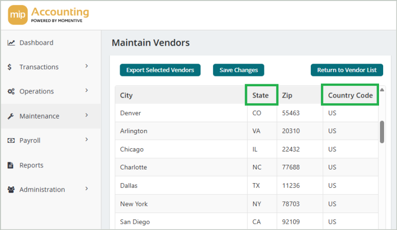 When exporting vendor records through the Automated Payments Vendor Export in MIP Modern, vendor addresses are now automatically split into Street Address 1 and Street Address 2 in the vendor export file. This helps ensure accurate formatting for Corpay. No other fields in the vendor export file are affected by this change.