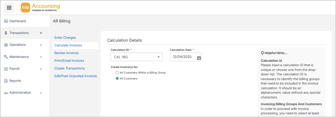 If you select a previously calculated ID and make changes, all previously calculated invoices remain unchanged.