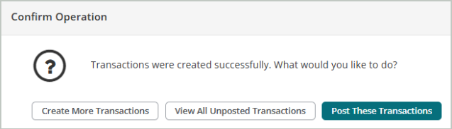 You can choose to keep creating transactions, review your unposted transactions, or you can immediately post your transaction entries to the general ledger.