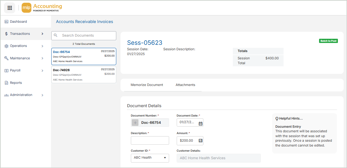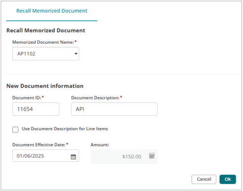 The Document ID, Document Description, Document Date, and Document Effective Date will auto-populate based on the memorized document you selected above. You can leave these as-is or enter new values. Note that the Document ID can't be the same as an existing ID in this session.