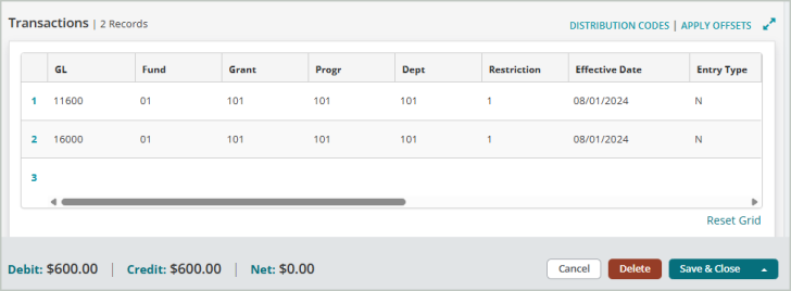 In order to save or post an entry, every line item must include all required account codes (segments) for the organization, an invoice or credit number, a debit or credit amount, an effective date, an entry type, and a description. These fields appear on all transaction entry forms.