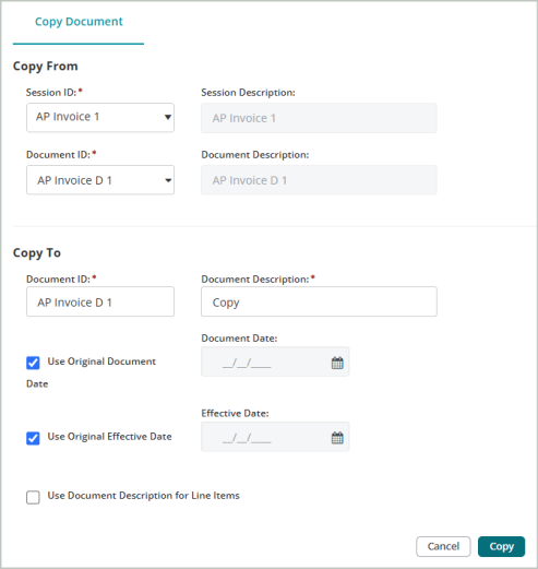 Use the Copy Document tab to copy a posted document from an existing session and add it to the current session. The copied document will be added to the session as an unposted document.