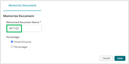 Select either Actual Amounts or Percentages for your memorized document. If you select percentages, the system converts the amount for each line item to percentages (100% for Debit and 100% for Credit). Use percentages if the currency amounts for the document vary each time it's recalled.