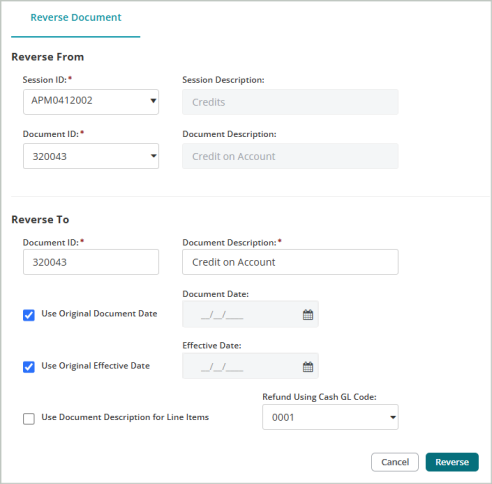 Use the Reverse Document tab to reverse a document from a previous session to a current session. The reversed document will be added to the session as an unposted document.