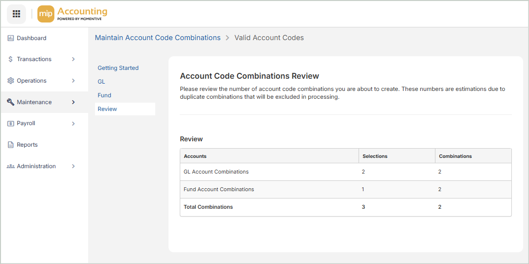 Create account code combinations for your organization. Account code combinations are specific groupings of segments from your chart of accounts - such as fund, department, program, or account - that define where a transaction is recorded in your accounting system. MIP validates all transaction and distribution code entries against the account code combinations you've set up, preventing the use of invalid combinations.
