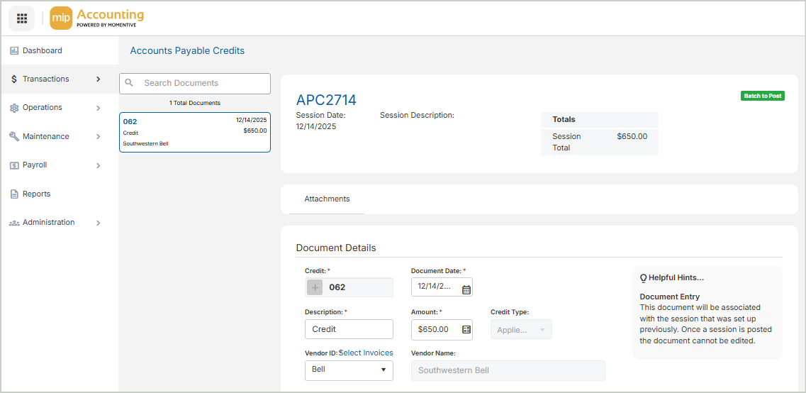 In order to save or post an entry, every line item must include all required account codes (segments) for the organization, an invoice or credit number, a debit or credit amount, an effective date, an entry type, and a description. These fields appear on all transaction entry forms.