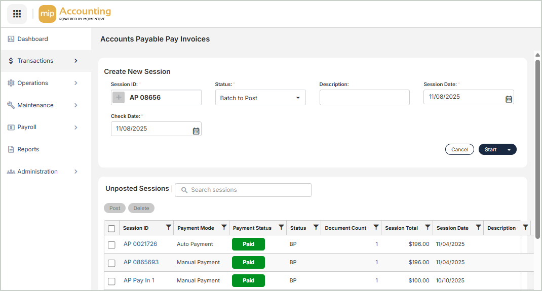 Session ID: Enter a value for the Session ID that represents the invoices you want to pay, or select the + button to generate one automatically. The Session ID links each transaction to its session, allowing you to track the origin of any entry.