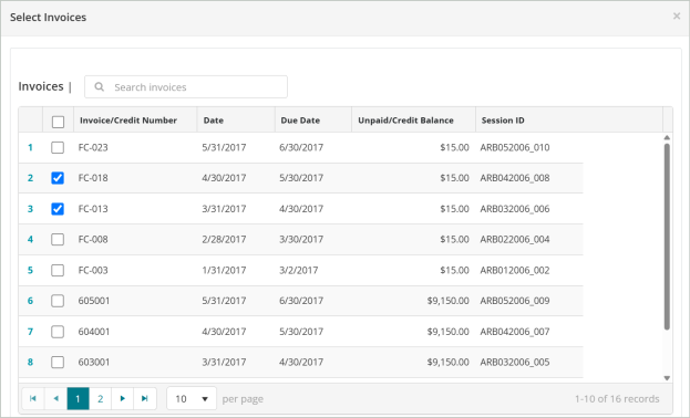 When you select a Customer ID, the Select Invoices form displays. Use this form to select the Invoice / Credit Numbers to apply to the document.