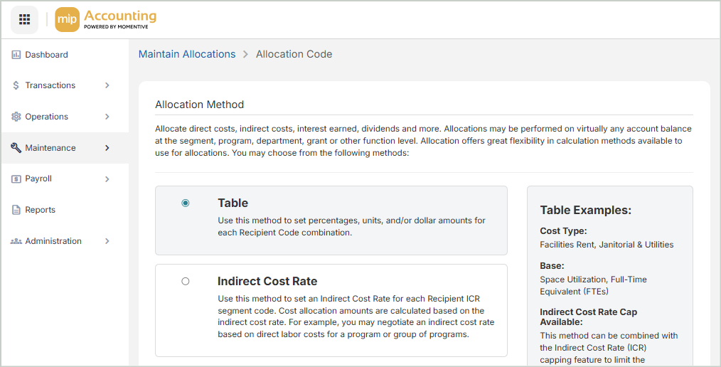 If the Table method was selected for this allocation code, the system will display the Table version of this tab.