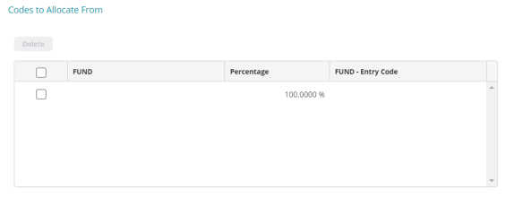 This grid displays the assigned pool codes and general ledger codes to allocate. The selected codes for the pool code and GL account to allocate from will determine the amount that is allocated to the recipient codes (with the exception of the indirect cost method). Selection of substitute entry code(s) and percentages is optional.