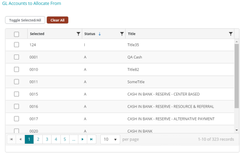 This grid displays the general ledger account that determines the amount to be allocated to the recipient codes. Only active or inactive general ledger codes will be available. The available GL codes will not include AP or AR (sub-ledger) account types.