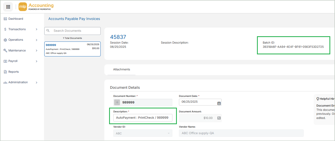 When an Auto Payments session has been paid, you'll find the payment details on the Pay Invoices page.