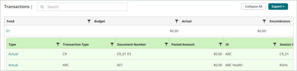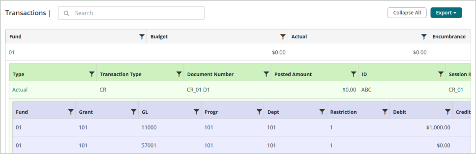 View the beginning balance, current activity, and ending available budget balances in the system. You can filter on specific dates, accounts, and criteria to determine which data to display in the grid.