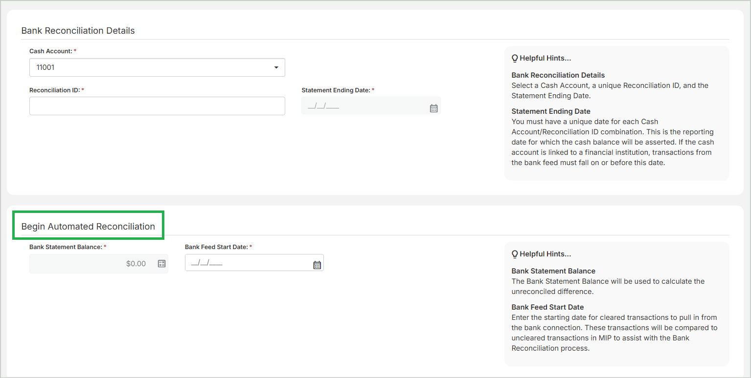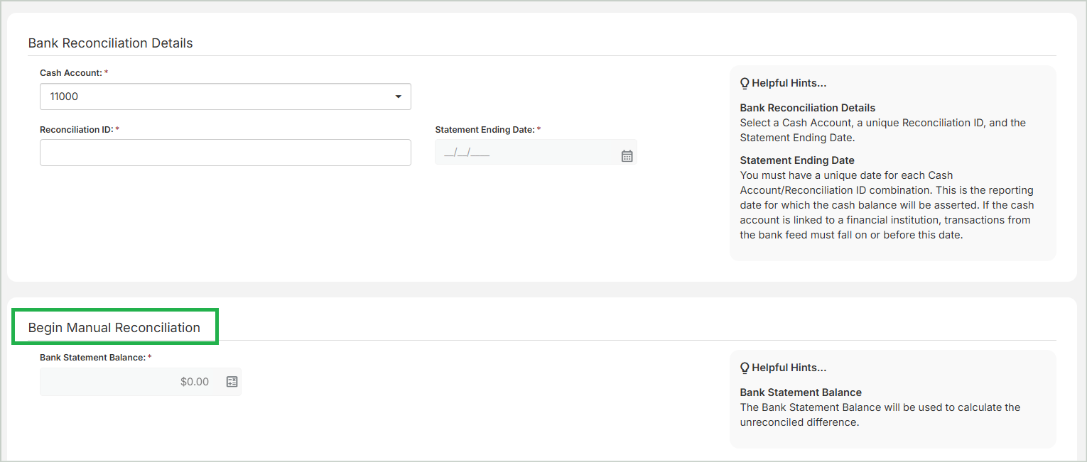 When adding a new reconciliation, the fields you see here depend on whether your organization reconciles manually or automatically through your connected bank account.