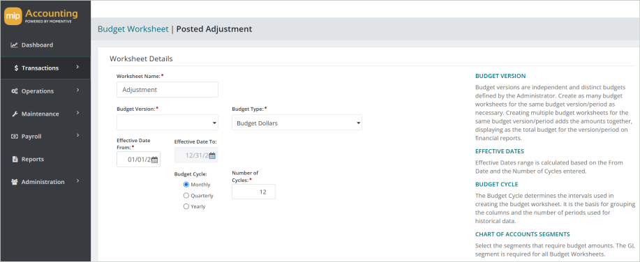 Budget Cycle: Select a Monthly, Quarterly, or Yearly budget cycle for the worksheet.