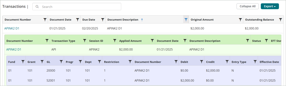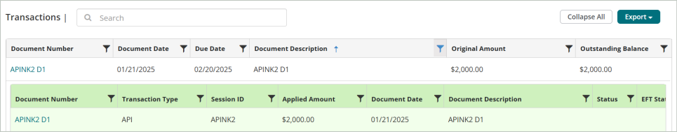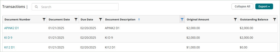 The Transactions grid displays the results based on the filters you applied above, with columns varying depending on the chosen AR code. You can drill down into specific transactions and documents. You can Export your data in PDF or XLS format.