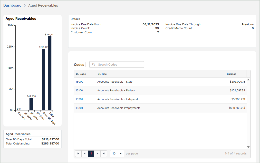 The Aged Receivables chart displays the outstanding amounts owed to your organization. Hover over a bar in the chart to view the exact amount. Select a bar to drill down into the corresponding aging range and access related GL code records and customer details.