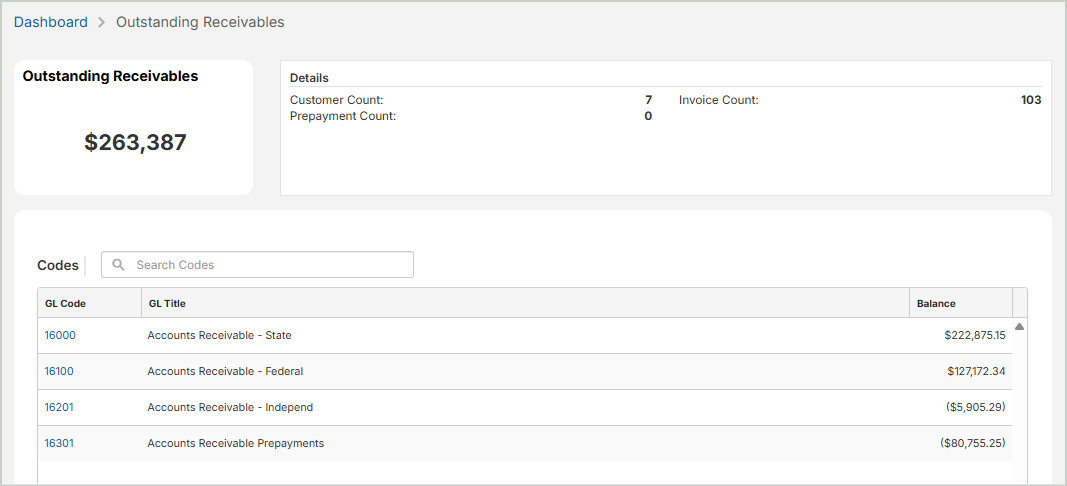 Customer Count: The total number of customers specific to the GL code selected. This represents the customers who have unsettled transactions (including all debts owed to your organization).