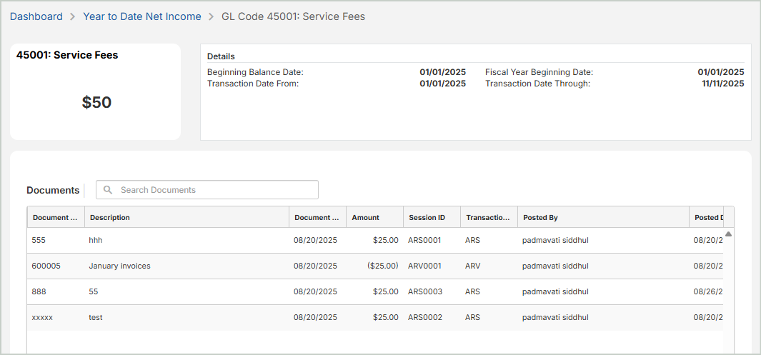Document Number: The number assigned to the document. Select a Document Number to view the transactions entered for the document.
