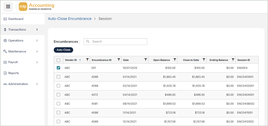 Select an Encumbrance to close by selecting the checkbox next to the encumbrance. Once you've chosen your encumbrances, select Auto-Close.