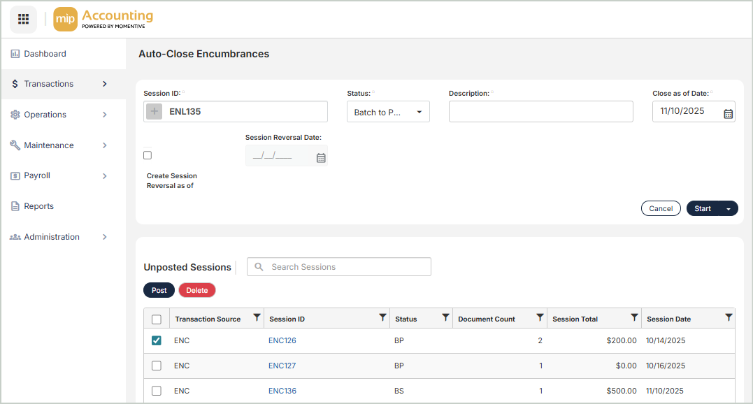 The Unposted Sessions grid displays all sessions that haven't been posted. From this grid, you can view, edit, or post sessions. After the session is processed but before it's posted, you can edit each Encumbrance through Transactions > Encumbrances > Liquidate Encumbrances for the close process and Transactions > Encumbrances > Encumbrances for the reversal session.