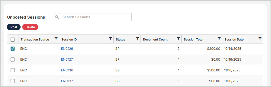 Post - To post a session, select it from the grid, then select Post. You can only post sessions that have a status of BP.