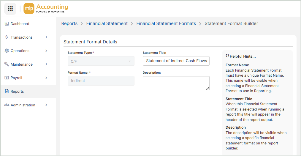 Format Name: Enter a unique format name for the Financial Statement Format.