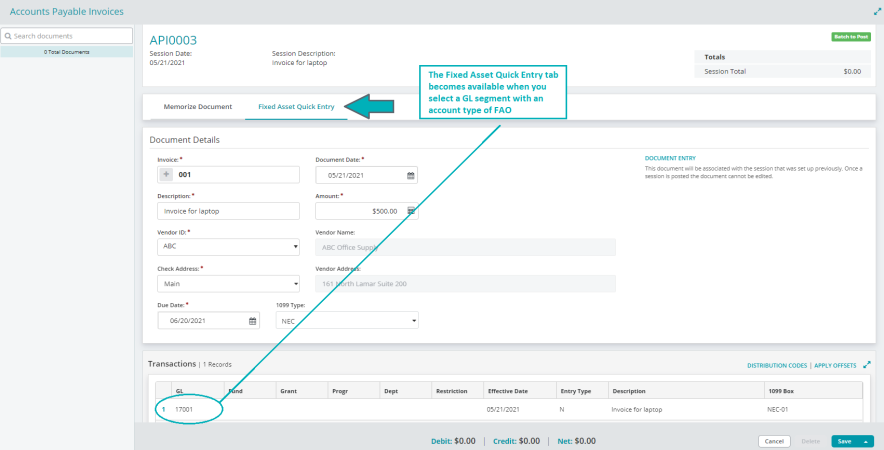 Use the Fixed Asset Quick Entry tab to quickly add an asset to a cash disbursement or AP invoice without having to exit the session. This feature is available in the Cash Disbursements and Accounts Payable modules.