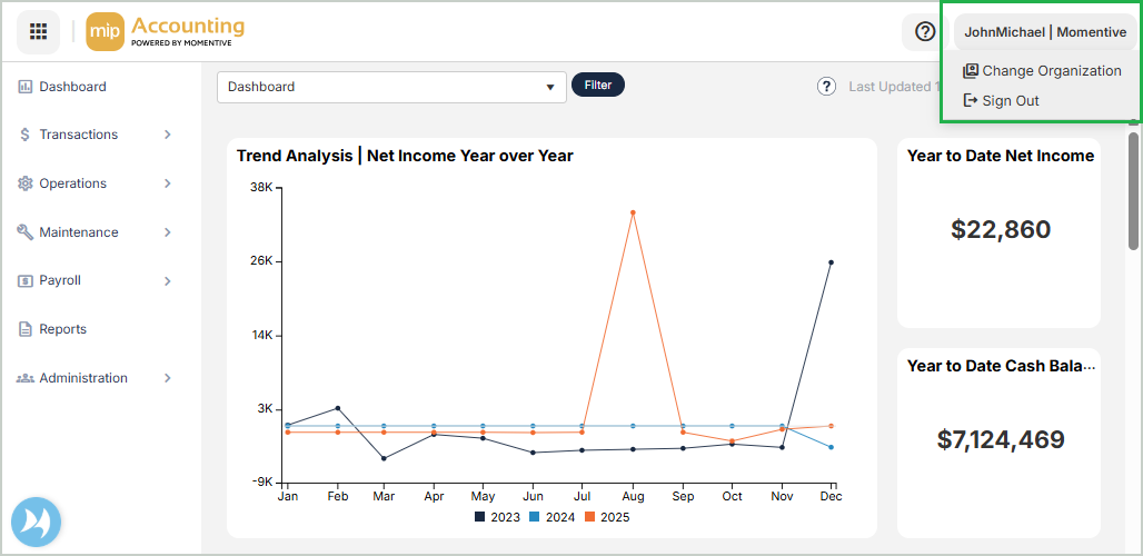 Change Organization - If you have access to multiple organizations in MIP Modern, you can switch between them using this menu. The organization you select here retains the next time you sign in.