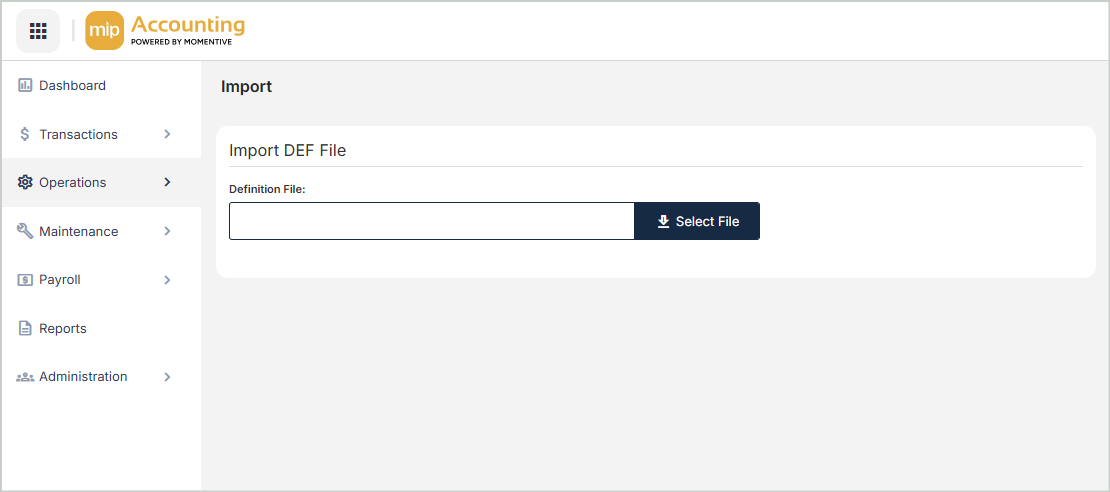 Importing allows you to take data from an external file and import it into MIP; an alternative to entering data manually in MIP. Use this form to select the definition file (.DEF) and associated data files - fixed width or comma separated variable (.TXT or .CSV) to be imported to the system. Definition files map to data files to be imported, while data files contain the actual data being imported.