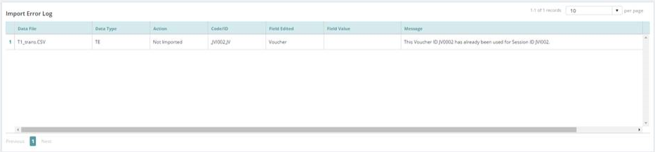 If any errors were encountered during import, the system displays a warning message followed by an Import Error Log. Make note of the error before closing this log.
