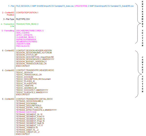 Note: The following illustration outlines the statements and sections of a definition file. It is NOT intended to represent an actual definition file. For example, the UPDATEITEM formatting statement nor the UPDATETS formatting statement should not be used with this type of CSV file, but this is the correct placement for either statement. This illustration is combining multiple statements into one example; therefore, its focus is on the placement of the statements, not the data.