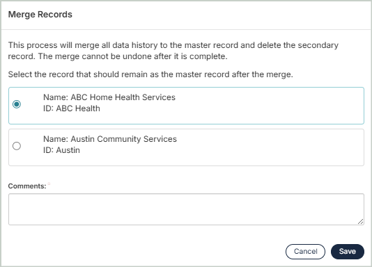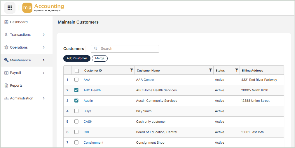 You can merge two customer records to combine all data history into a master record and delete the secondary record. To merge, select two customers from the grid, then select Save. Choose which record you want to keep as the master. Note that this action is permanent and cannot be undone.