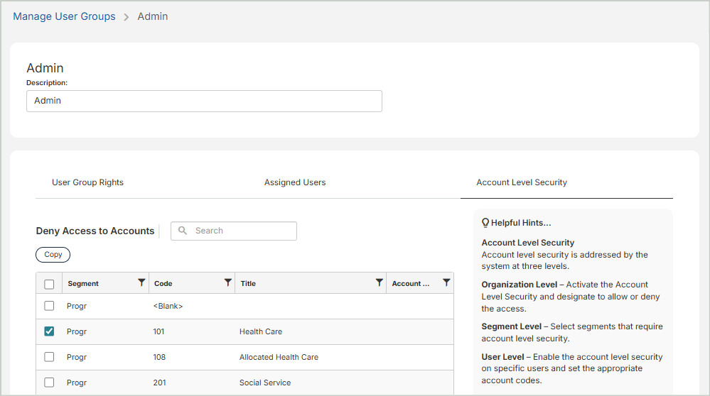Copy: Use this option to copy account security settings from another user group to the selected group.