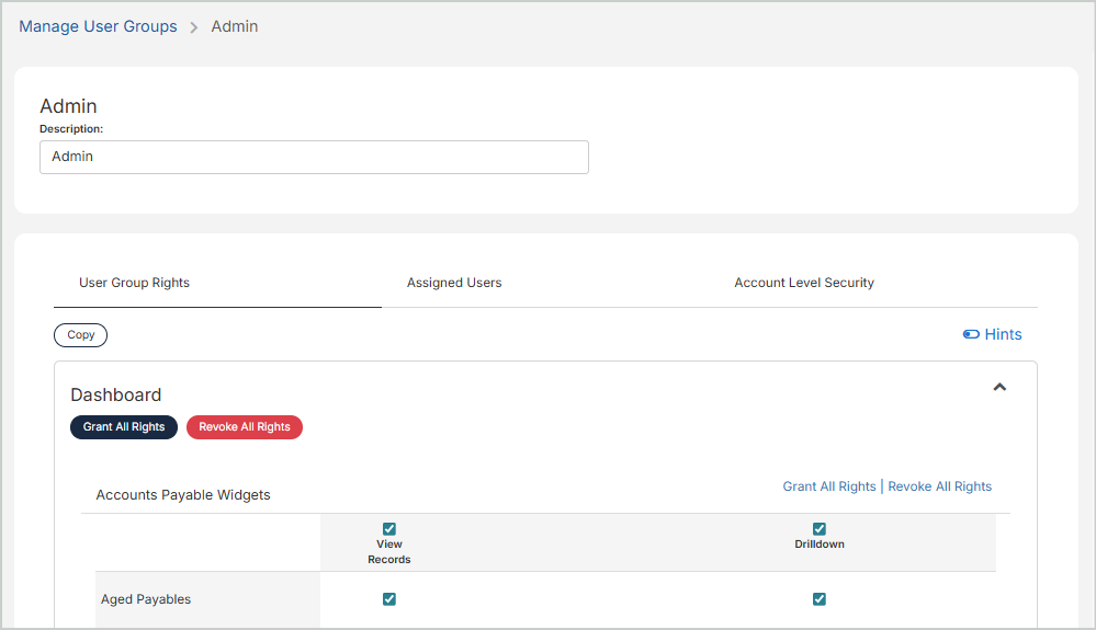 Grant All Rights: Select to grant all rights for that module to the user group.