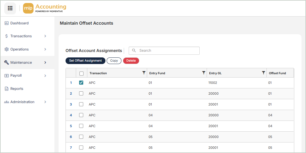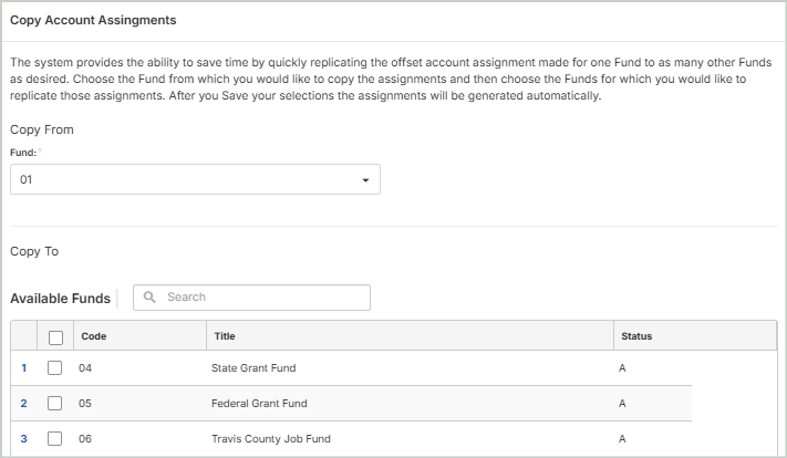You can quickly copy offset assignments from one fund to as many other funds as desired. Simply select the fund to copy from and the funds to copy to. Once you select Copy, the assignments will be generated automatically.