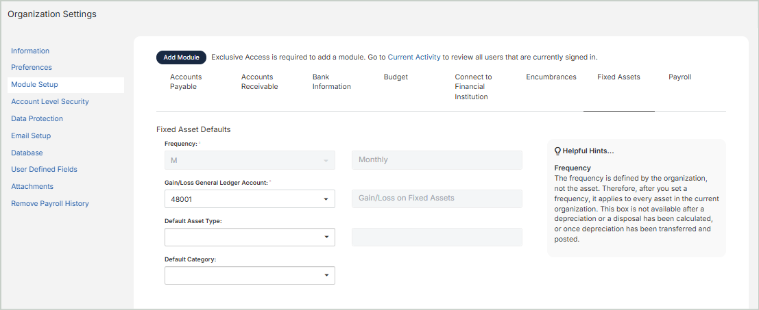 Default Asset Type: Select a default asset type. This asset type will auto-populate anytime you create a new asset, either through the Fixed Assets module or using Asset Quick Entry within other modules.