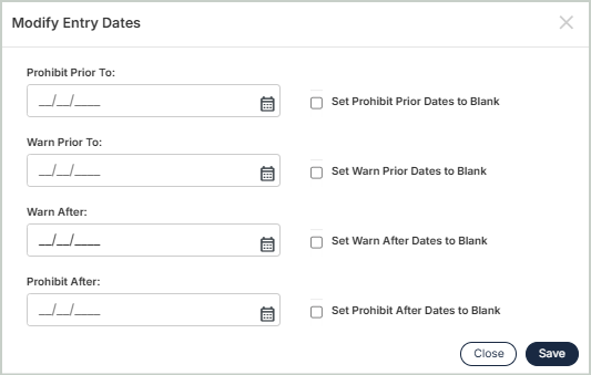 Prohibit After: Prevents transactions from being entered with an Effective Date later than this date. An error message displays, and the transaction cannot be entered.