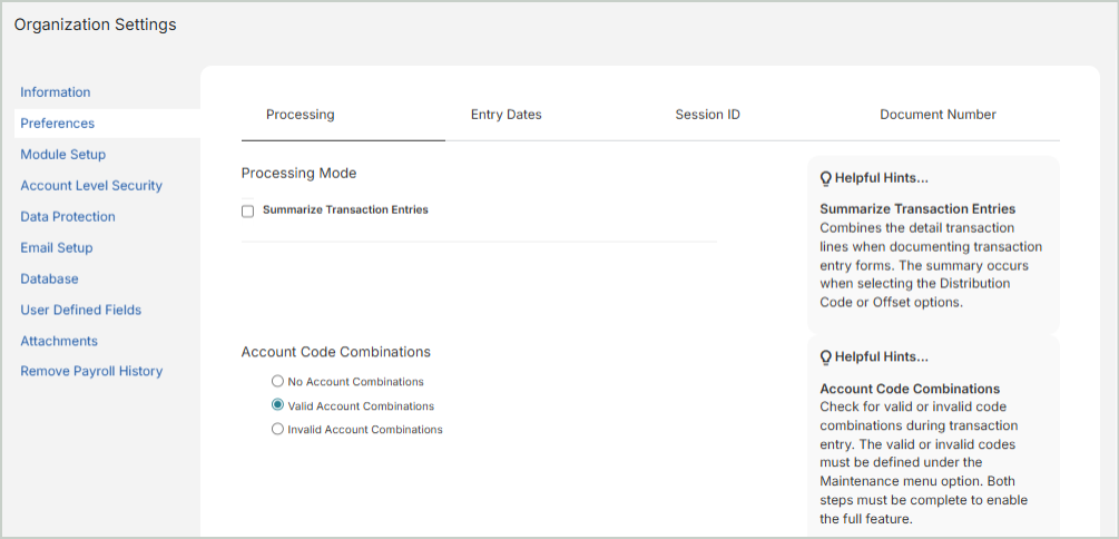 Verify Account Code Combinations during Setup, Transaction Entry, and Processing: Select this option to verify account code combinations during Setup, Transaction Entry, and Processing for your organization.