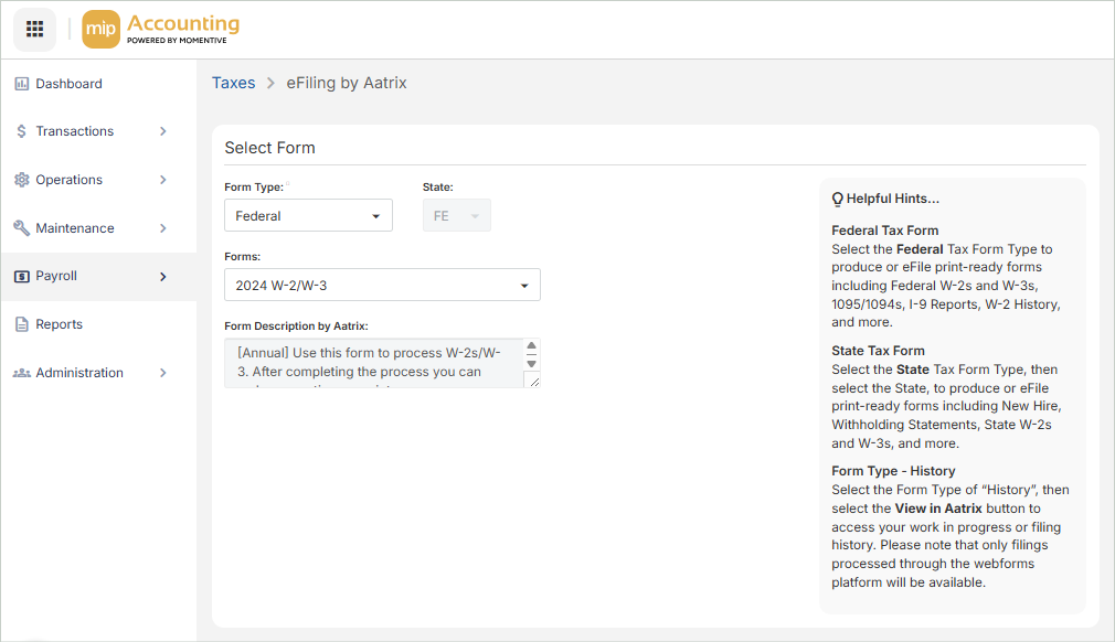 MIP Modern integrates with Aatrix Web Forms, a software platform that streamlines the preparation and filing of tax documents. Use this form to specify the details needed to generate W-2s, W-3s, and 1094/1095 forms for your employees and the IRS. Then use Aatrix to eFile your forms for a fee. Watch our video overview of the Aatrix workflow.