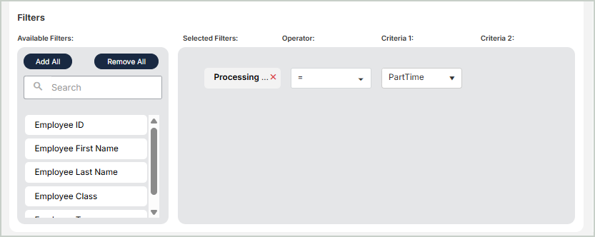 | Equal to (=) | Include the data equal to the value in Criteria 1. For example, if "Status" is the Selected Filter and "A (Active)" is the Criteria 1, then include all data with a Status of Active in the report. |
