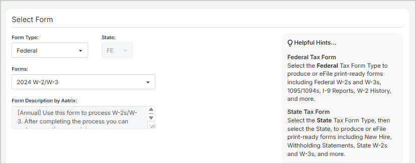 Federal or State - If you haven’t filed yet for the current year, select which form to produce - either Federal or State. This will create a new form that pulls in your most recent data from MIP. If you've already started your filing but you need to refresh your accounting data since the last time you used Aatrix, select either form type here to start new.