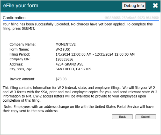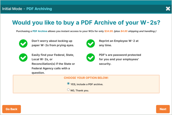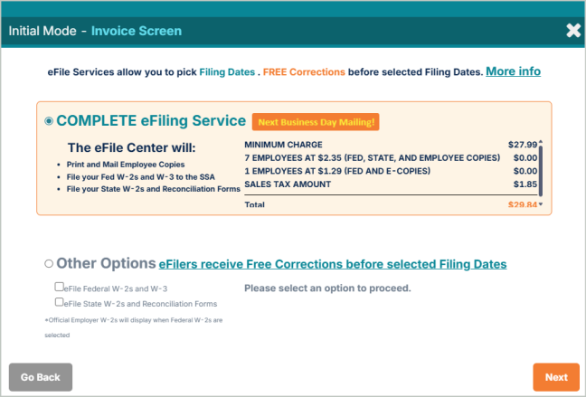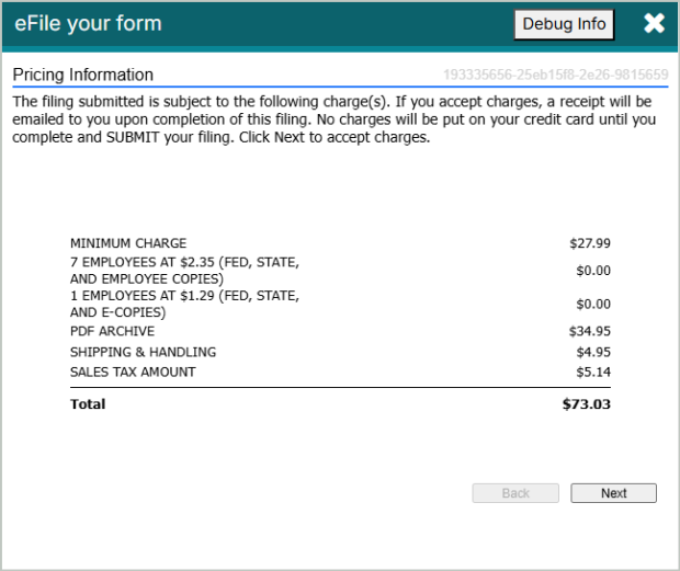 After you've completed all the validations, you'll select your filing options. Pricing is based on the number of employee records to be processed. You also have the option to buy a PDF archive of your forms.