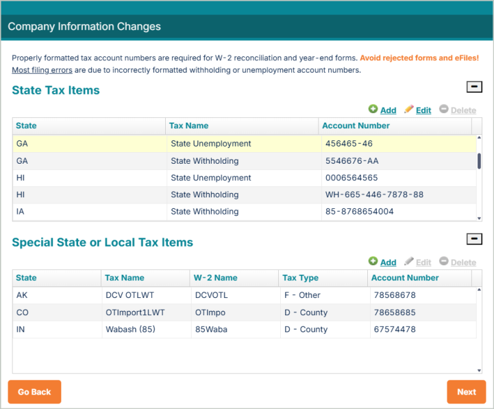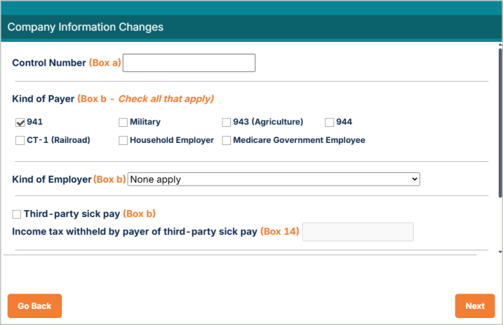 Next you'll be prompted to enter the information that goes on your W-3. This information is also available to be edited once you're in the actual grid.
